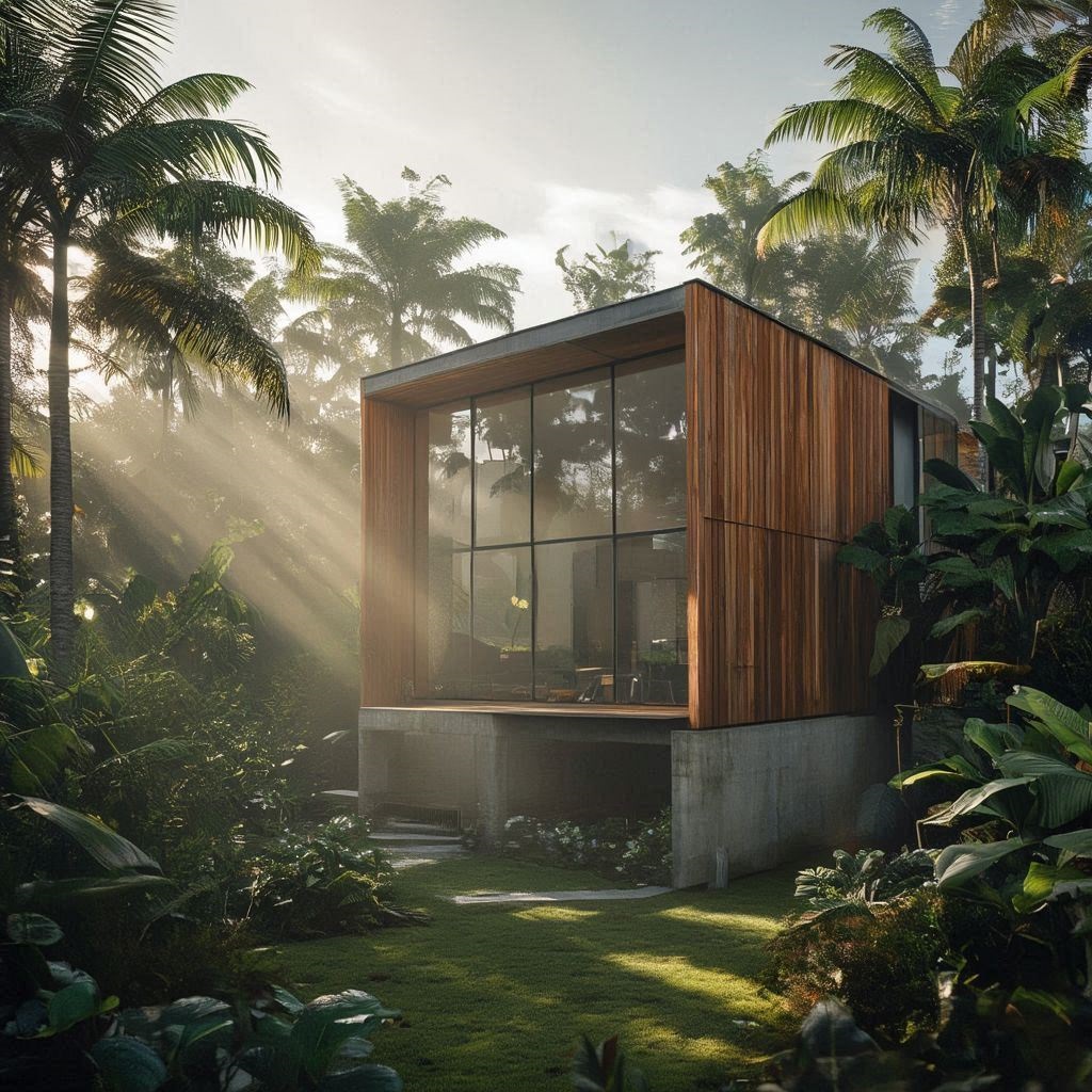 “Modern tropical house with full-height glass façade, warm teak wood panels, concrete base structure, surrounded by lush tropical landscape. 24mm wide-angle lens, soft morning sunlight, volumetric light through trees. PBR materials, realistic reflections, subtle imperfections. Rendered in ultra-realistic style, cinematic mood, Octane render quality.”