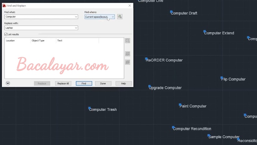 Fitur find and replace juga bisa digunakan untuk mengganti text yang sama di dalam satu dokumen. Walaupun text berada di layout ataupun di model sekalipun. Fitur find and replace akan mengganti semua text yang sesuai dengan keyword yang di berikan.