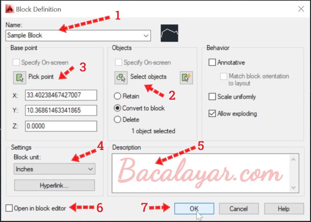 • Setelah muncul jendela Block Definition kamu bisa mengisi beberapa pilihan yang diperlukan ketika membuat sebuah block.