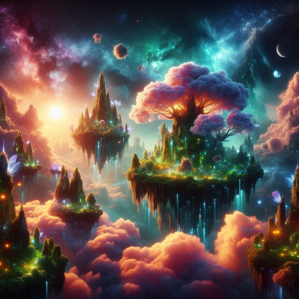 “Surreal dreamscape with floating islands, glowing crystalline trees, cosmic nebula sky. Cinematic lighting, volumetric clouds, 8K detail, painterly realism.”