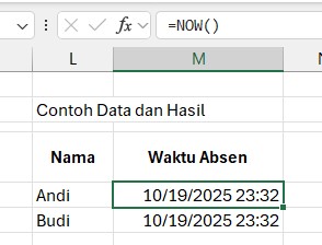 Hasil: Excel otomatis menampilkan tanggal & jam saat ini (misalnya 19/10/2025 08:15).